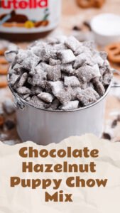 The ultimate sweet & salty snack! This easy Chocolate Hazelnut Puppy Chow is dangerously delicious and perfect for parties, gifts, or a quick treat. #puppychow #muddyduddysnack #chocolatehazelnut #partysnack #easydessert
